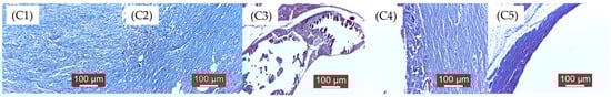 Histopathological examination micrographs for samples (C1–C5) (i.e., Mg-0.5Ca-xSr alloys containing 0.5, 0.1, 1.5, 2, 3% Sr) after 12 weeks of implantation (see the text for details).