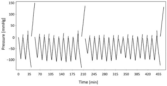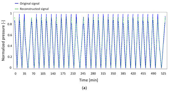 Circuit pressure data collected during the weight loss sensor self-tests of a dialysis equipment were used to train and test the model. A total of ~150 pressure–time graphs were analyzed, all representing normal operating conditions without drifts or malfunctions. This dataset was intentionally limited to ideal cases to enable the model to effectively learn and generalize the expected pressure patterns during standard sensor self-tests. Following standard machine learning practice of adopting an 85-15 split of the available data [], 103 signal time-series (~85%) were allocated for training, while the remaining 20 signals (~15%) were reserved for testing the model’s performance. Within the training set, 20% of the sequences were further held out as a validation set. This validation subset was used exclusively to monitor the model’s generalization performance during training and to guide hyperparameter tuning. Notably, this setup ensured that no information from the test set was used during model development, thus preventing data leakage and overfitting.