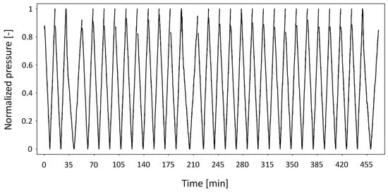 where is the raw pressure at time , and and are the minimum and maximum values of the same signal, respectively. The normalization ensured that all signals were rescaled within the [0, 1] interval, making them directly comparable across tests, regardless of their absolute pressure values.