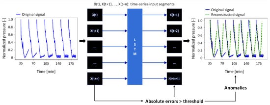 Working principle of the LSTM model used for anomalies detection. Legend: solid line (blue signals): original anomalous input; broken line (green signals): reconstructed “correct” version generated by the model; X(t), X(t + 1), …, X(t + n): time-series input segments used by the model to learn and predict future system behavior.