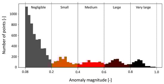 Histogram of anomalies distributed according to their magnitude. The description of the issue associated with each range is reported in Table 2.