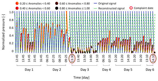 Figure 7 shows the reconstructed signal (dashed green line) for anomaly condition Type 1, overlapped with the original signal (solid blue line). Machine failure events are highlighted with red circles along the abscissa-axis, which represents time in days, further divided into hourly intervals. The same legend is consistently used in the subsequent figures (Figure 8, Figure 9, Figure 10, Figure 11, Figure 12 and Figure 13).