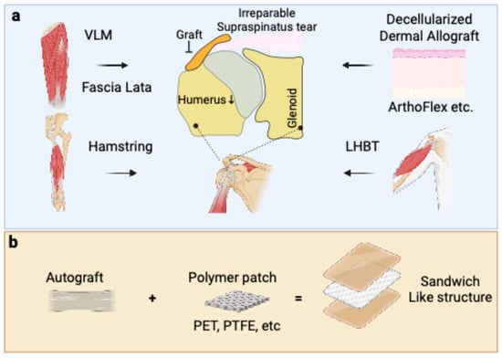 Schematic overview of current and emerging graft choices for the ASCR. (a) Current biological graft choices used to bridge the glenoid and the greater tuberosity of the humerus. These include autografts, such as fascia lata, hamstring tendon, and the long head of the biceps tendon (LHBT), as well as allografts like decellularized dermal tissue (e.g., ArthoFlex). (b) Emerging strategy involving a composite, sandwich-like structure that combines an autograft with a synthetic polymer patch made from materials such as polyethylene terephthalate (PET) or polytetrafluoroethylene (PTFE) to enhance the mechanical strength of the reconstruction.