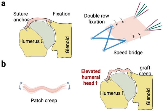Schematic of autograft fixation of the ASCR and the mechanism of failure due to graft creep. (a) Graft fixation for ASCR. A graft is securely attached to the superior aspect of the glenoid and the greater tuberosity of the humerus using a “speed-bridge” configuration to ensure a broad and stable footprint. (b) Long-term failure mechanism known as “graft creep”, losing its initial tension and structural integrity. This elongation of the graft leads to a loss of its restraining function, resulting in the superior migration or elevation of the humeral head. The arrow indicates the direction of movement of the humeral head.
