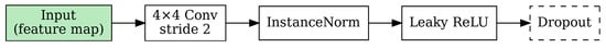 Each downsampling block consists of a single 4 × 4 convolutional layer with stride 2 and padding 1 for spatial reduction, followed by instance normalization and LeakyReLU activation (α = 0.2). All convolutional layers employ spectral normalization for training stability [38], and dropout (p = 0.1) is applied for regularization, where represents the feature map at the i-th stage.