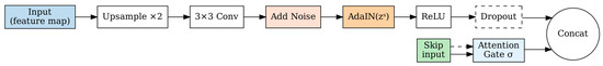 As shown in Figure 4, each upsampling block in the decoder follows a structured pipeline: bilinear upsampling (×2), 3 × 3 convolution, Gaussian noise injection, AdaIN conditioning, and ReLU activation. Skip connections from the encoder are processed through attention gates before concatenation: