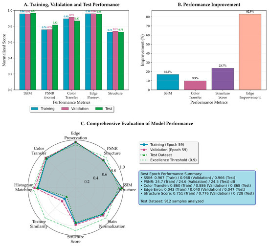 The comprehensive evaluation demonstrates state-of-the-art performance across all assessed metrics, with particularly notable achievements in structure preservation (SSIM: 0.966 ± 0.008), edge retention (0.047 ± 0.009), and perceptual quality (FID: 32.12). The framework’s ability to maintain diagnostic features while achieving effective color normalization represents a significant advance toward reliable multi-institutional digital pathology workflows.