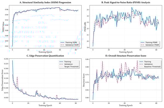 The progressive curriculum learning approach demonstrates clear advantages over the standard training protocol. The three-phase strategy (structure-focused, balanced, and color-focused) enables hierarchical learning that mirrors human visual processing. Training dynamics analysis reveals distinct improvement patterns during each phase, with structure preservation scores improving from 0.68 to 0.73 during the initial phase, accelerating to 0.78 during balanced training, and stabilizing at approximately 0.80 during color refinement. This systematic progression prevents the common issue of structure-color trade-offs that plague existing methods [50,51].