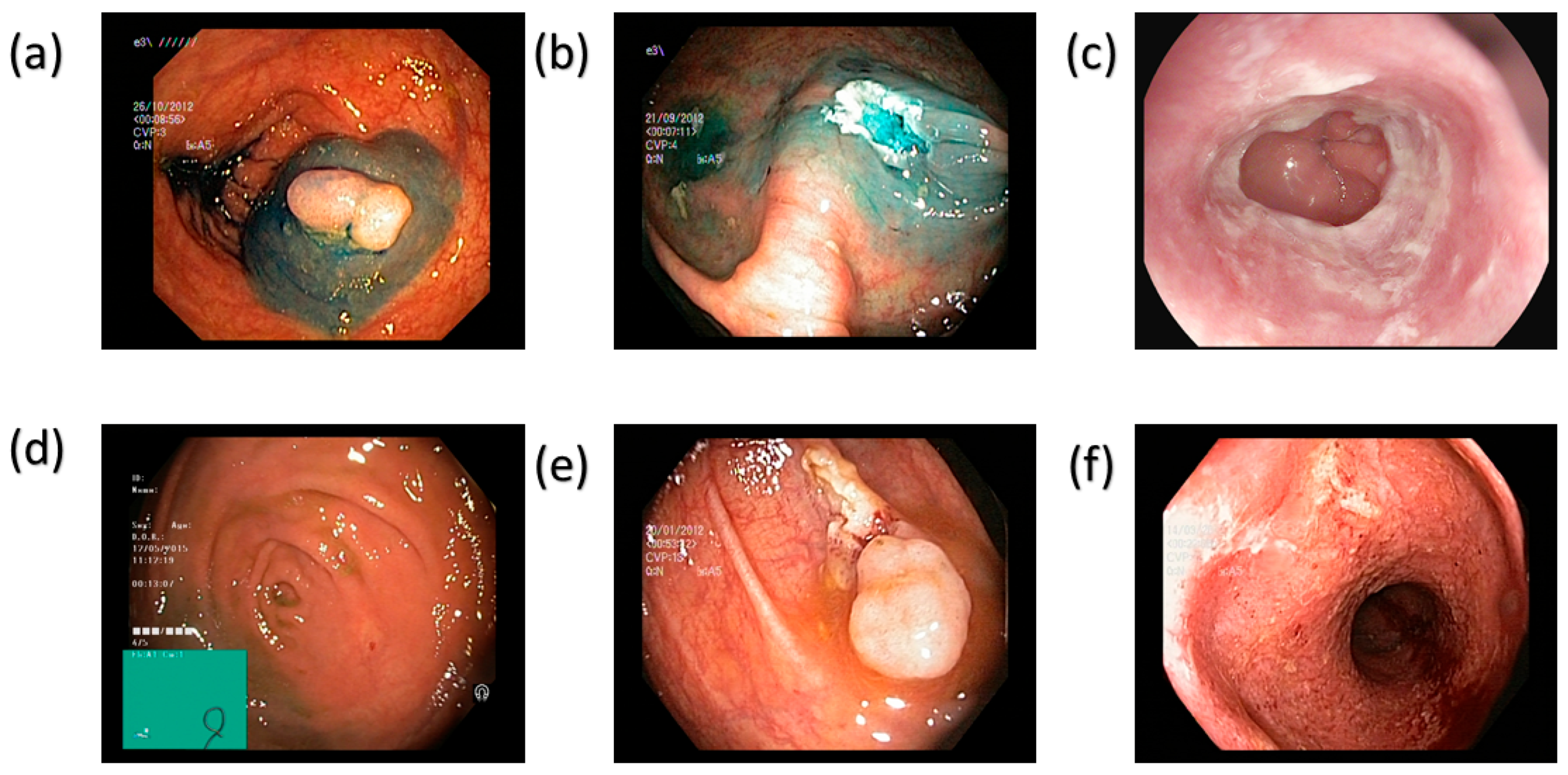 - Ebigbo, A.; Mendel, R.; Probst, A.; Manzeneder, J.; de Souza, L.A., Jr.; Papa, J.P.; Palm, C.; Messmann, H. Computer-aided diagnosis using deep learning in the evaluation of early oesophageal adenocarcinoma. Gut 2019, 68, 1143–1145. [Google Scholar] [CrossRef]