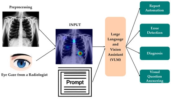 - Kim, Y.; Wu, J.; Abdulle, Y.; Gao, Y.; Wu, H. Enhancing human-computer interaction in chest X-ray analysis using vision and language model with eye gaze patterns. arXiv 2024, arXiv:2404.02370. [Google Scholar]