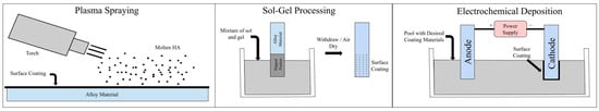 Calcium phosphate coatings can be deposited using various techniques, including plasma spraying, sol–gel processing, and biomimetic methods [,]. Plasma spraying remains the most widely used clinical approach despite its limitations related to coating uniformity and control over crystalline phases. In contrast, alternative methods, such as sol–gel, in which implants are dipped into a mixture of sol and gel prior to being withdrawn and air dried, and electrochemical deposition, in which a power supply is used to coat the surface of the cathode with a desired material, permit better control of microstructure and composition [,]. The schematics of these coating processes are visible in Figure 1. However, these approaches are less common in clinical settings due to challenges in scalability and mechanical durability, especially in high-load applications.