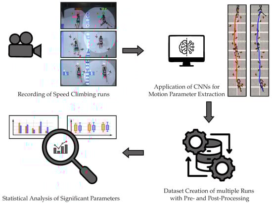 Visualization of the methodology from Speed Climbing recordings, through the CNN-based extraction of motion parameters from multiple runs, to dataset creation and the statistical analysis of significant performance parameters.