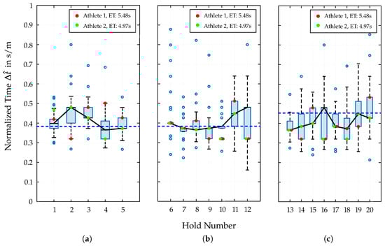 Distribution of the normalized relative split times to each hold (1–20) of the Speed Climbing wall divided into the start (a), middle (b), and end (c) section. The red and green dots indicate the corresponding split times of two athletes with different morphological characteristics and performance outcomes. The dashed blue line indicates the average value, while the black straight line depicts the course of the median for per section.