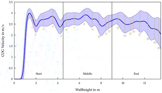 The end section of the Speed Climbing wall is also characterized by jumps and skipping holds, which lead to drops in speed, as well as a consequent increase in split times, throughout this entire segment. To illustrate the relationship with the athletes’ split times, the distribution of the velocity data from the entire dataset is presented in Figure 3. For each 5 cm interval from the bottom to the last hold of the wall, the velocities of the athletes in the mentioned dataset are sampled, and the mean and standard deviation are calculated at each point. Additionally, the positions of the 20 hand holds are marked with orange dots, linking the calculated split times with characteristic key transition points in the velocity profile.