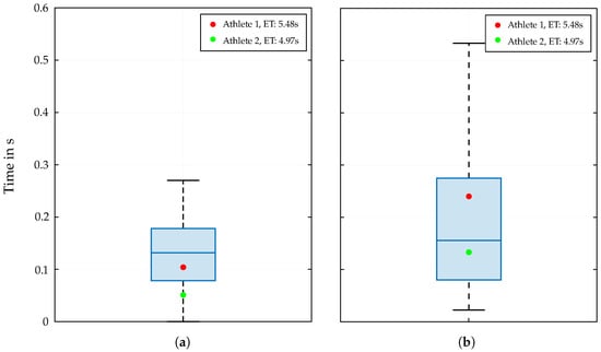 The results of the reaction time , measured from the manually determined start signal to the actual movement of the athlete and its COG, show a remarkable high maximum value of 0.27 s (Figure 4a). For the jump time , the data points correlate with the number of executed steps ahead of the final jump to the buzzer, where an additional intermediate step leads to time losses.
