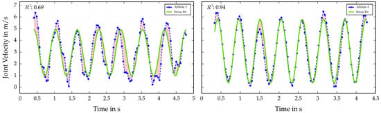 As already mentioned, the velocity trajectories of hands and feet are analyzed to investigate the athletes’ limb coordination during Speed Climbing movements. The fitted sinusoidal model (Equation (8)) is used to evaluate the velocity profiles of hands and feet, providing insights into the athletes’ movement patterns and coordination. The results of this analysis are presented in Figure 5, showing the fitted sinusoidal models for the right foot velocity of two athletes with different performance outcomes.