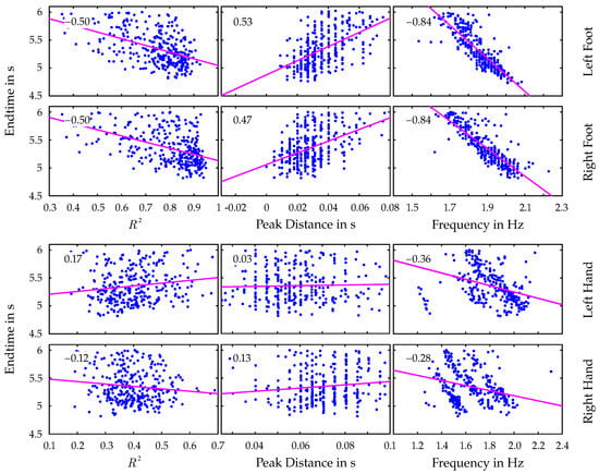 The correlation between these parameters and the achieved end time is calculated for each limb using Pearson’s correlation coefficient. Parts of the resulting correlation matrices, namely the relations between end time and the mentioned parameters, are visualized in Figure 6.