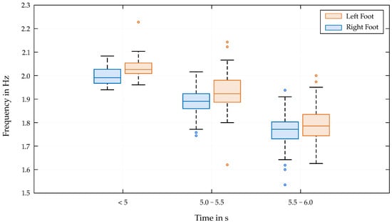 The correlations of the mentioned parameters with the end time for the lower limbs clearly confirm the second hypothesis of this study, which states that the coordination of individual limb movements correlates with competitive success in Speed Climbing. The results show that better-performing athletes exhibit higher values, smaller peak distances, and higher frequencies in their limb movements. The high correlation between end time and values indicates that athletes who can maintain a consistent and coordinated movement pattern are more likely to achieve better performance outcomes. The obtained results are consistent with those of Cordier et al. [], who describe the measured parameters as an entropy index. Figure 5 (right) demonstrates how exceptionally well the data points of a successful athlete adapt to a single-frequency sine wave, resulting in a high value close to 1. The smallest deviations from a regular movement due to technical errors in the execution of the movement sequences are also reflected in the rise in peak distances. Despite its correlation with (−0.70 for the left foot; −0.77 for the right foot), the consideration of the peak distances is important, as it provides additional insights and helps to identify potential weaknesses in the athletes’ movement patterns. While a significant correlation between lower end times and higher frequencies is not surprising, the distribution of the frequency over the entire time range is interesting. Figure 7 shows that the scatter of frequencies is greater for athletes with poorer performances. This indicates that an increase in frequency could affect the correct execution of the movements, leading to less-efficient patterns or errors. This distribution is substantially lower for the group of athletes achieving remarkable end times below 5 s.