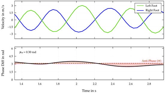 For this purpose, the raw data of Athlete 4 (Table 2) were preprocessed by subtracting the mean value and filtering the signal using a bandpass filter. The frequency range of the filter was set to 0.5–3 Hz, which covers, including a safety margin, the previously calculated dominant frequencies of the limb velocity for the whole dataset. The instantaneous phase shift distribution is then determined as stated in Equations (13) and (14) for left and right foot velocity data. The velocity distributions, as well as the absolute and wrapped phase difference reduced to the middle section, are shown in Figure 8.