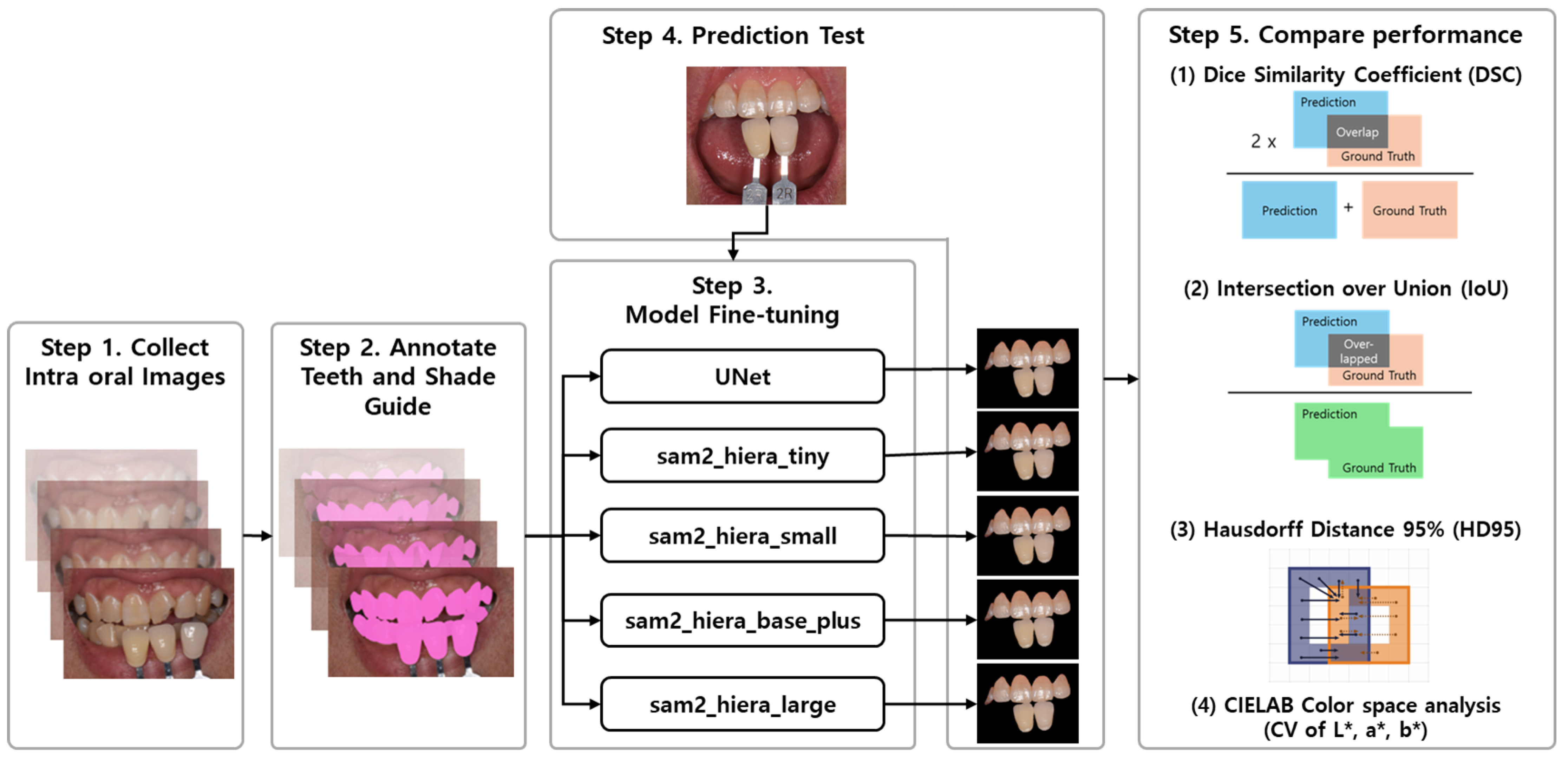 Chicago/Turabian StyleHan, KyeongHwan, JaeHyung Lim, Jin-Soo Ahn, and Ki-Sun Lee. 2025. "The Evaluation of a Deep Learning Approach to Automatic Segmentation of Teeth and Shade Guides for Tooth Shade Matching Using the SAM2 Algorithm" Bioengineering 12, no. 9: 959. https://doi.org/10.3390/bioengineering12090959