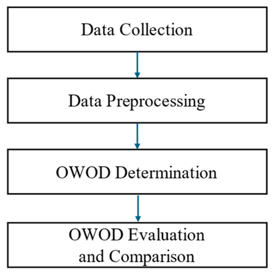 Research methodology consisting of four main processes: data collection, data preprocessing, optimized weighted objective distance (OWOD) determination, and OWOD evaluation and comparison.