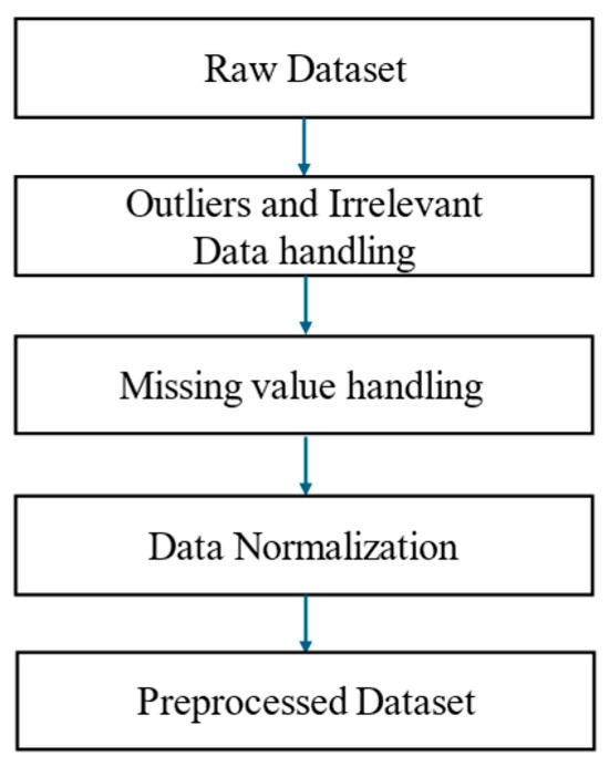 Data preprocessing workflow comprising outlier and irrelevant data handling, missing value imputation, and data normalization.