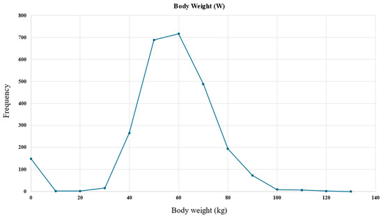 It can be observed in Figure 3 that weight values within the 0–40 kg range were erroneous entries. To address this, the data were filtered to exclude values falling outside the expected distribution range. The missing body weight entries were attributed to the most commonly occurring value, which was 60 kg.