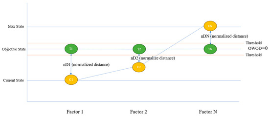 where refers to the target value of attributes, refers to the acceptable state value of attributes, and refers to the distance between the target and acceptable states.