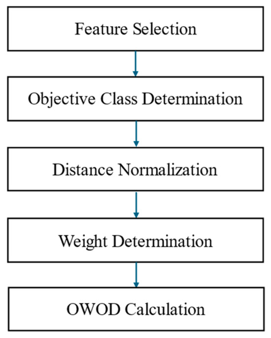 The optimized weighted objective distance (OWOD) determination process comprising feature selection, objective class determination, distance normalization, weight determination, and OWOD calculation.
