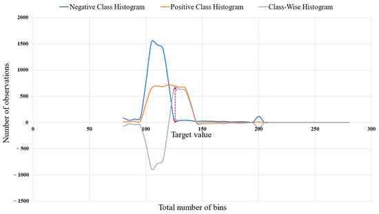 where n refers to the total number of observations, k refers to the total number of bins, and refers to the histogram data. The target value was defined as the value of observation k corresponding to the maximum positive difference between the histograms of the positive and negative classes. This objective value was determined from the class-wise histogram distribution presented in Figure 6.