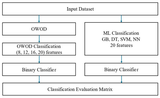 Traditional classifiers such as DT, SVM, and NN exhibited further limitations, with lower recall, F1-score, and AUC-ROC values in both validation and testing. While computationally efficient, these models often struggle with complex decision boundaries and noisy/overlapping feature distributions. The OWOD incorporates a distribution-based entropy framework and utilizes optimal thresholds derived from class-wise histograms, allowing for the capture of fine-grained patterns that rigid or margin-based decision mechanisms in DT, SVM, and NN may overlook. In this context, the OWOD outperformed ensemble and traditional classifiers in predictive accuracy and robustness.