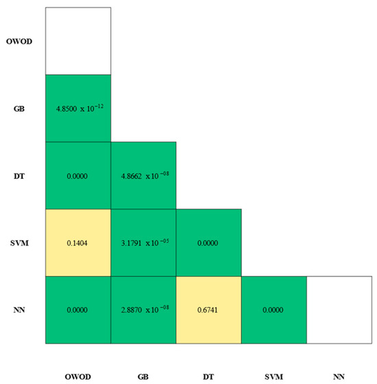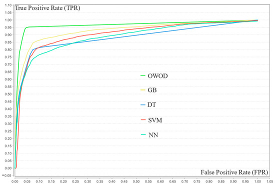 The testing results confirm the superior classification performance of the OWOD compared with conventional ML algorithms. The OWOD achieved the highest scores across all evaluation metrics, with an accuracy of 95.45%, a precision of 96.14%, a recall of 94.70%, an F1-score of 95.42%, and an AUC-ROC of 97.10%. This reflects the ability of the OWOD to accurately identify positive and negative classes, maintaining a high balance between sensitivity and specificity. GB demonstrated reasonably strong precision (90.90%) but a poorer recall (84.90%) and F1-score (87.80%), indicating a greater likelihood of missing TP cases. Traditional models such as DT, SVM, and NN exhibited even lower recall and AUC-ROC values, indicating limited effectiveness in differentiating between classes. These findings demonstrate that the OWOD delivers high classification performance and offers enhanced generalization capability when applied to previously unseen data.
