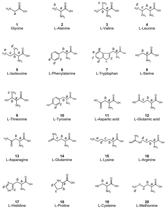 Amino acids, the building blocks of proteins, form polypeptides through specific sequences of 20 standard types, each contributing to the final three-dimensional structure and function of the protein. In addition to their structural roles, amino acids serve as precursors of neurotransmitters and hormones. For example, glutamic acid functions as an excitatory neurotransmitter and is a known precursor of γ-aminobutyric acid (GABA) and a key intermediate in amino acid metabolism []. Similarly, tryptophan is a biosynthetic precursor of serotonin and melatonin compounds involved in the regulation of mood, sleep, and circadian rhythms, making it an important modulator of physiological functions in the central nervous system [,].