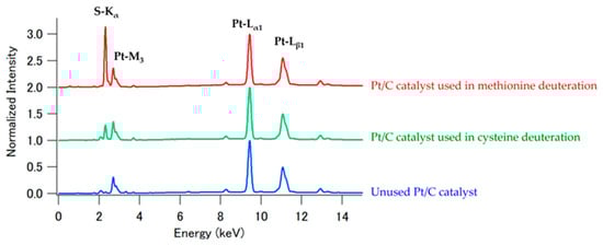 In addition, the chemical compositions of the used Pt/C catalysts were analyzed using XRF method (the details of the XRF measurements are described in the Supporting Information). Figure 3 shows the XRF spectra of the Pt/C catalyst before and after the deuteration experiments. The XRF spectrum of the Pt/C used for methionine deuteration had a large sulfur peak, whereas the XRF spectrum of the Pt/C used for cysteine deuteration had a small sulfur peak. These results indicated that methionine strongly coordinated to the Pt/C surface, whereas cysteine hardly coordinated to Pt. It is reasonable to suppose that, because the pKa value of the thiol group in cysteine is approximately 8.3, which is protonated in the reaction mixture, the coordination ability of cysteine to Pt is probably weak.
