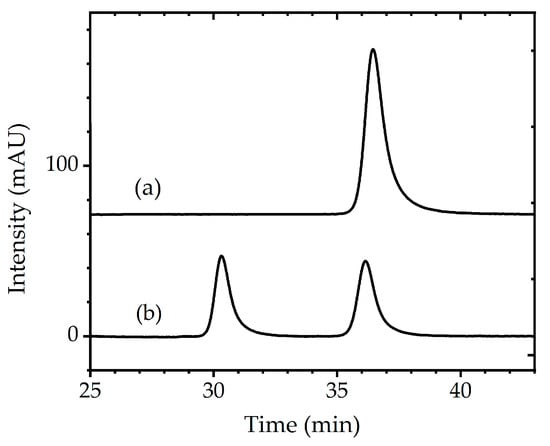 Enantiomeric separation using chiral column chromatography. (a) Commercial L-tryptophan (h-L-Trp); (b) Deuterated tryptophan. Detection was performed with excitation at 250 nm and emission at 350 nm.