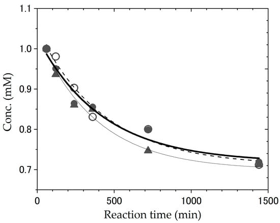 Time-dependent fluorescence intensity of tryptophan in acidic aqueous solution. Open circles represent commercially available hydrogenated tryptophan (h-Trp), closed triangles represent 40% deuterated tryptophan (d40-Trp), and closed circles represent 70% deuterated tryptophan (d70-Trp) synthesized in this study using a simple deuteration apparatus. Dashed, thin, and solid lines indicate the fitted curves for each dataset. The vertical axis indicates tryptophan concentration (mM), and the horizontal axis represents reaction time (min). Fluorescence measurements were performed with an excitation wavelength of 290 nm and an emission wavelength of 339 nm. The sample solutions were prepared at room temperature and required approximately 60 min to reach and stabilize at 80 °C; therefore, data collected prior to 60 min were excluded from the kinetic analysis.