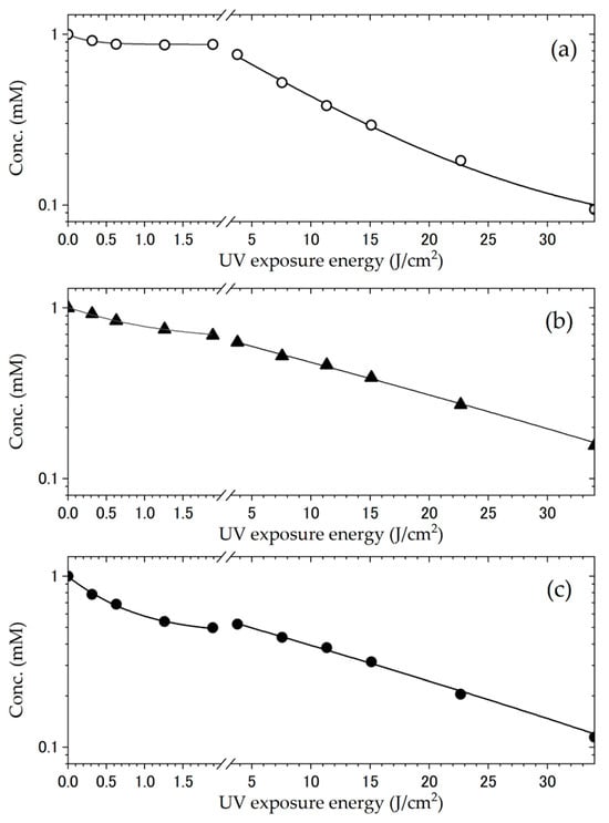 Previous reports have suggested that the UV degradation of tryptophan is mono-exponential [,], but our results are clearly different. Our findings may be attributed to the detailed evaluation of tryptophan UV degradation reactions at irradiation doses of 0–2.0 J/cm2. Assuming that the UV degradation of tryptophan is a pseudo-first-order reaction [], the value of kobs can be calculated using Equation (1).