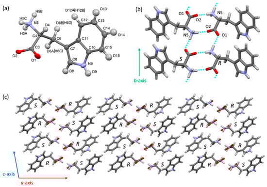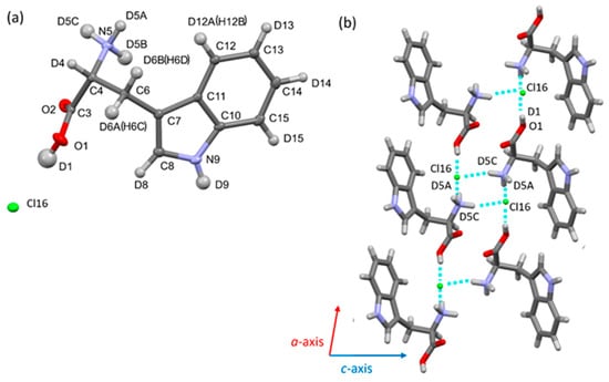 (a) Crystal structure of the deuterated tryptophan chloride (d-TrpCl) as ellipsoid model with a probability of 50%. The crystals were obtained as racemic conglomerate, the structure analyzed crystal consists of (R)-tryptophan. (b) Tryptophane cations and chloride anions are liked to form three-dimensional hydrogen bond network.