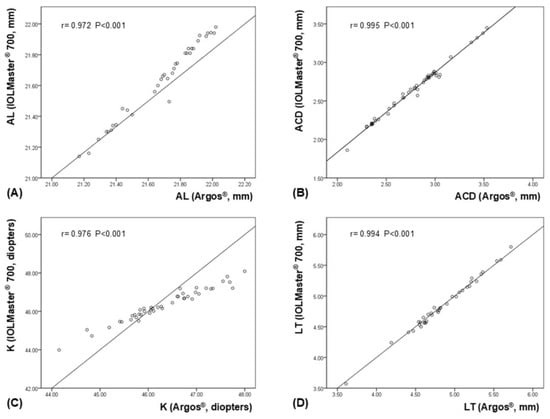 Scatterplots depicting significant correlations between the ARGOS® and IOLMaster® 700 for each ocular biometric parameter. (A) axial length (AL), (B) anterior chamber depth (ACD), (C) keratometry (K), and (D) lens thickness (LT).
