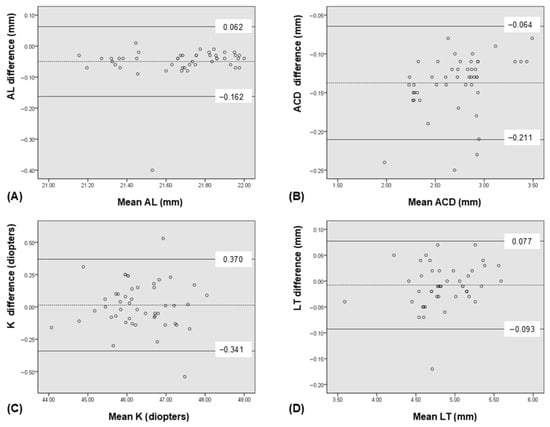 The ICCs for the biometric measurements obtained using the IOLMaster® 700 and ARGOS® were 0.975 for AL, 0.957 for ACD, 0.988 for K, and 0.994 for LT, indicating a high level of agreement between the two devices across all parameters. Regarding the comparison of each parameter, ARGOS® showed significantly longer AL measurements than did the IOLMaster® 700 (p < 0.001). ACD measured with the ARGOS® was also significantly greater than that measured with the IOLMaster® 700 (p < 0.001). There were no significant differences in K (p = 0.585) and LT (p = 0.117) measurements between the two devices (Table 2). Scatterplots demonstrated significant correlations for AL, ACD, K and LT between the two devices (Figure 1). Bland–Altman plots showed good agreement for AL, ACD, LT and K between the devices (Figure 2).