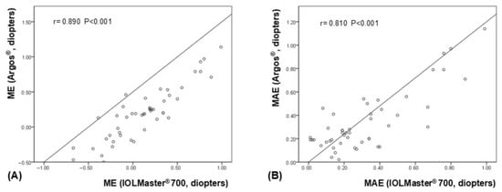 Scatterplots illustrating the significant correlations between refractive prediction errors obtained using the ARGOS® and IOLMaster® 700. (A) mean arithmetic prediction error (ME), (B) mean absolute prediction error (MAE).