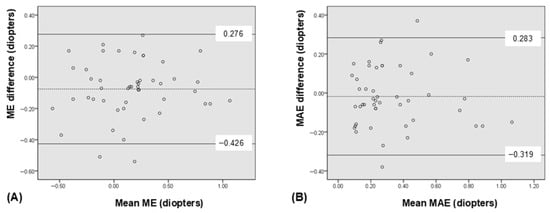 Both ME and MAE measured using IOLMaster® 700 and ARGOS® showed significant correlations (p < 0.001 for both, and ICC = 0.874 and 0.811, respectively). Scatterplots showed significant correlations in both ME and MAE (Figure 3). The relevant Bland-Altman plot is shown in Figure 4.