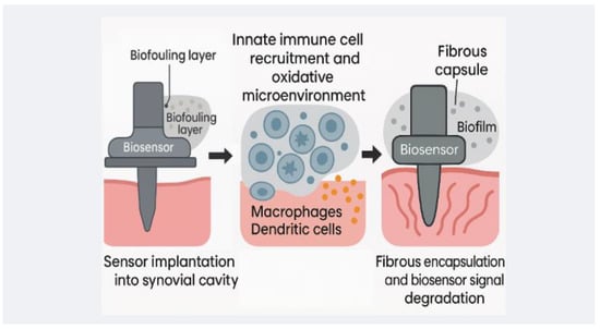 Schematic illustration of material-environment interactions in implantable biosensors, highlighting critical challenges such as immune response, encapsulation, and signal interference. Such dynamics are central to biosensor design in total knee arthroplasty applications.