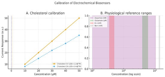 Panel (A) shows representative calibration curves for cholesterol detection using cyclic voltammetry (CV) and chronoamperometry (CA), illustrating differences in sensitivity and detection limits (CV: 1.2 × 10−7 M; CA: 5.4 × 10−7 M). Panel (B) highlights physiological concentration ranges for key biomarkers relevant to implantable biosensors, including dopamine (1–106 nmol/L), glutamate (40–60 μmol/L), potassium (3.5–5 mmol/L), and sodium (135–145 mmol/L). Together, these examples demonstrate the importance of reporting calibration data and contextualizing biosensor performance within physiologically relevant ranges.