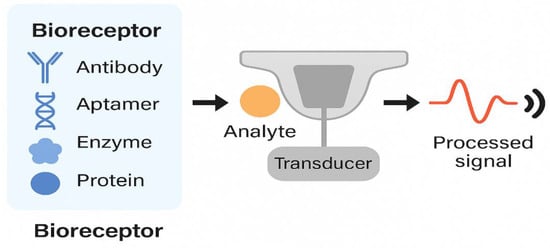 Schematic structure of a biosensor showing core components—bioreceptor layer, transducer element, and signal processor—functioning as a unified detection and transmission unit. This modular architecture forms the basis for integration into smart tibial implants.