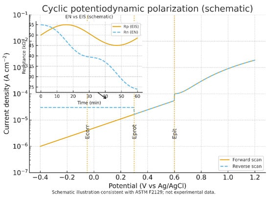 Cyclic potentiodynamic polarization and electrochemical noise context. The forward and reverse scans illustrate a typical ASTM F2129 curve, with corrosion potential (Ecorr), passive region, pitting potential (Epit), and protection potential (Eprot) annotated. The inset contrasts polarization resistance from EIS (Rp) with noise resistance from electrochemical noise measurements (Rn), highlighting that Rn can decline earlier during pit initiation. Schematic illustration consistent with ASTM F2129; not experimental data.