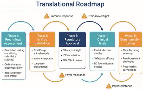 Translational roadmap for biosensor-enabled tibial components in TKA. The figure outlines five sequential phases: preclinical assessment, in vivo validation, regulatory approval, clinical trials, and commercialization, along with representative activities and major barriers (such as immune response, ethical oversight, payer resistance). The roadmap emphasizes a recursive and interdisciplinary approach essential for successful translation from bench to bedside.