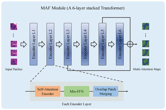 The MAF module is the core of the CAM generation and refinement stage. As shown in Figure 3, the MAF module is implemented as a single, stacked Transformer encoder composed of six sequential encoder layers to generate the hierarchical multi-resolution feature maps from the input images. Each encoder layer consists of three sub-modules: a self-attention encoder, a Mix Feed-Forward Network (Mix-FFN), and an overlapping patch merging unit.