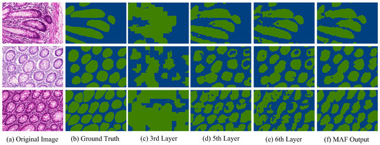 As illustrated in Figure 4, visualization comparisons showed that the third layer captures coarse localization of glandular regions, while the fifth and sixth layers provide increasingly refined boundary details. The combination of attention outputs of these three layers produced the pseudo-labels that could better approximate the ground truth and offer more reliable guidance for downstream segmentation. Compared with the standard class activation maps (CAMs), the MAF-based strategy generated the initial pseudo-labels with higher spatial precision and reduced noise.