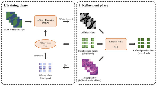 As illustrated in Figure 5, the AR module is trained iteratively with the affinity loss, to progressively improve affinity predictions. After training, the generated semantic affinity maps are combined with the initial pseudo-labels to produce the final pseudo-labels through a two-step process involving the PAR [29] and random walk propagation [30]. In this phase, the PAR is again implemented to adaptively smooth the initial pseudo-labels based on the learned affinity and image content, followed by a random walk algorithm to propagate semantic consistency across the entire image.